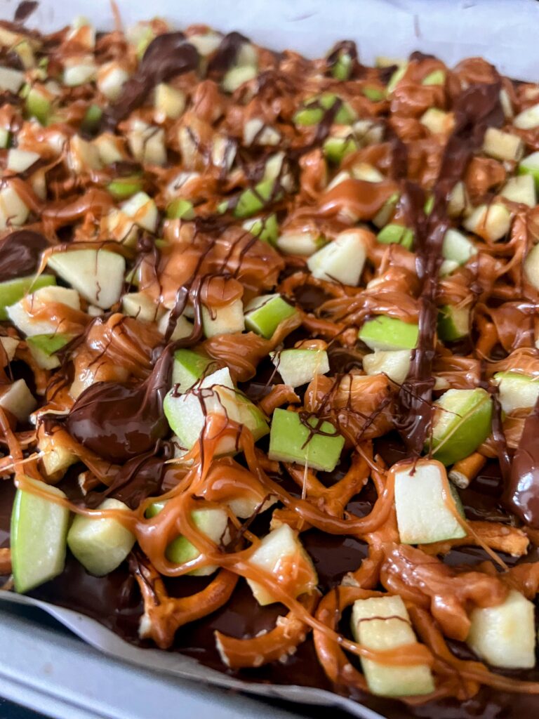 It’s also naturally festive—green apple pieces pop against the caramel and chocolate drizzle, and a sprinkle of flaky sea salt gives it that trendy sweet-salty finish.