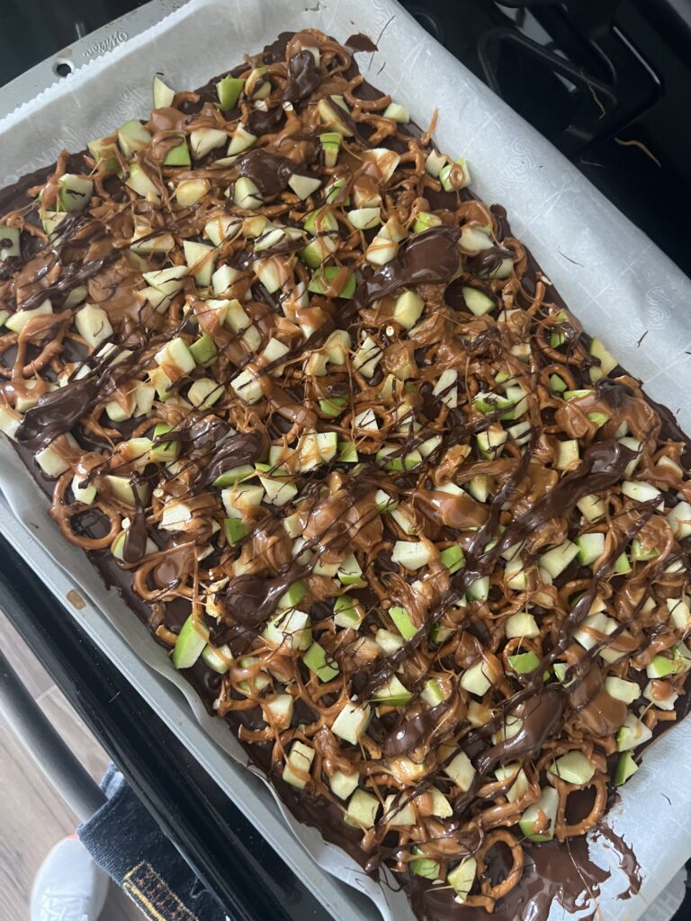 This recipe is ideal for letting kids help. They can stack the pretzels, sprinkle apples, and drizzle caramel. Because it sets up in the fridge, there’s instant gratification when they can break it into pieces and taste their work.