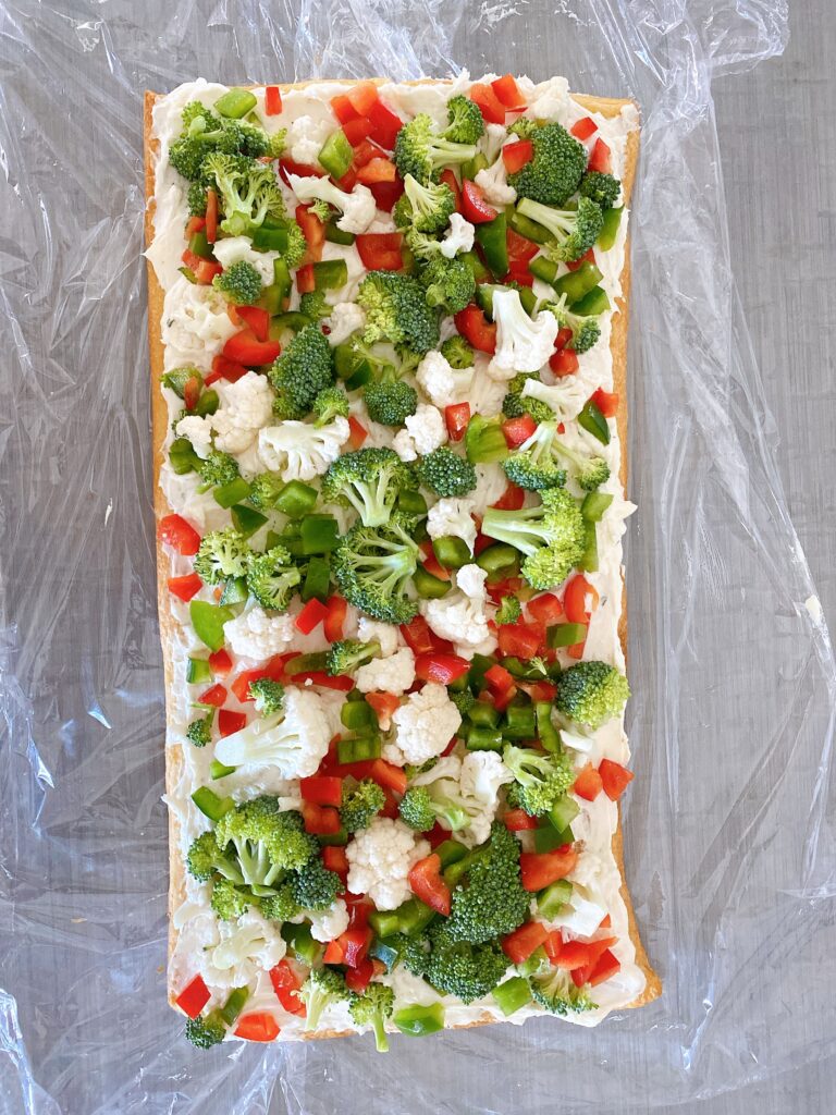 Here’s why: it feels indulgent (crescent dough crust, ranch cream cheese spread, optional cheddar on top), but it sneaks in a rainbow of vegetables and takes almost no effort.